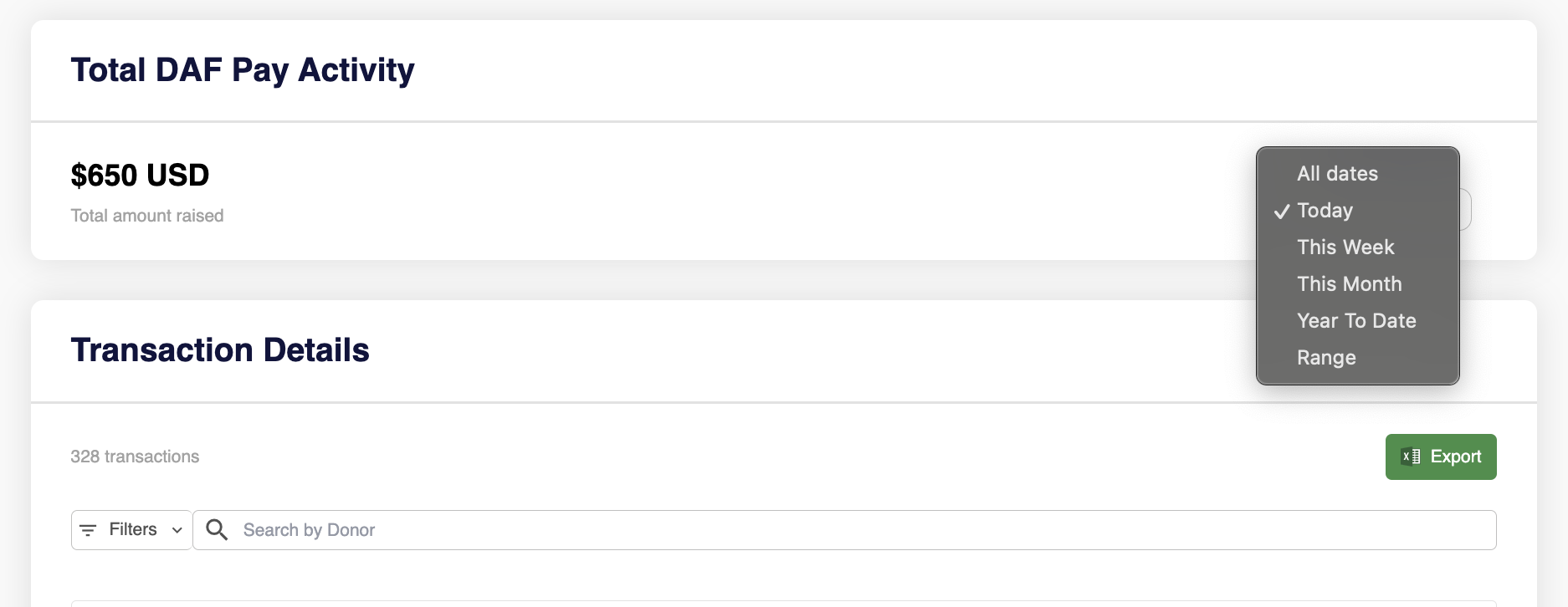 Under the Transactions section, select DAF to view a table with all donations made through DAF Pay.
