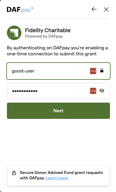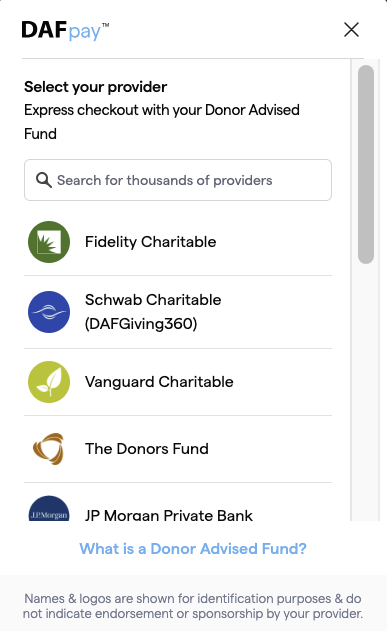 Once the DAF lightbox is displayed, the donor can select their provider, log in with their username and password, and complete their donation with the option to adjust the amount and contact information.